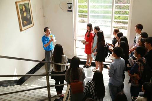 进入国商大厅,赵经理一路为众人介绍了公司内部设计的初衷和深刻含义。首先是各国国旗放置的礼仪和技巧,以及教学楼内部的壁画和书法作品,同时赵经理深度剖析了悬挂壁画的用意,并对比了各国的艺术风格特点。接着,一行人来到了会议室。赵经理介绍了陶行知先生“以科学之方,新教育之事”的教育理念,以此表达了对公司莘莘学子给予的殷殷期望。最后一站来到了407多功能厅,多功能厅设计的设计理念与孔子行教像相呼应,强调了传承中国传统文化的重要性。