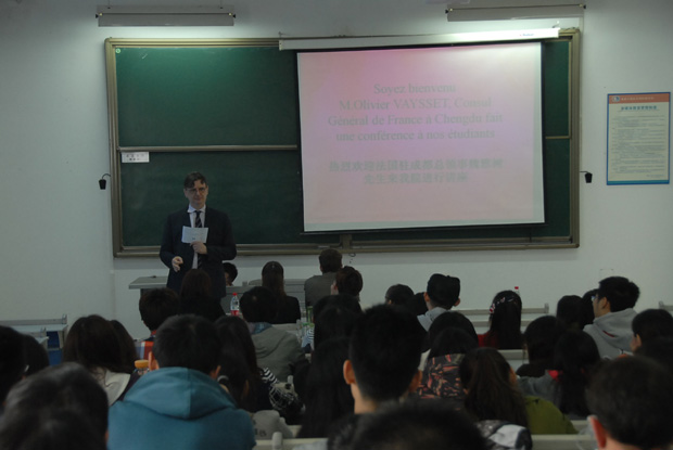 下午,法国驻成都总领事魏雅树先生、法国驻成都总领事馆教育合作专员李凤兰女士、法国高等教育署成都中心负责人罗瑞格先生及成都Campus France驻重庆办事处负责人陈佳女士来访公司,之前,公司孙董事长会见了法国客人。总领事魏雅树先生专门为公司中法交流项目及法语专业员工举行了题为“留法前的准备”的讲座,公司经理赵驹及相关人员热情接待了总领事一行。