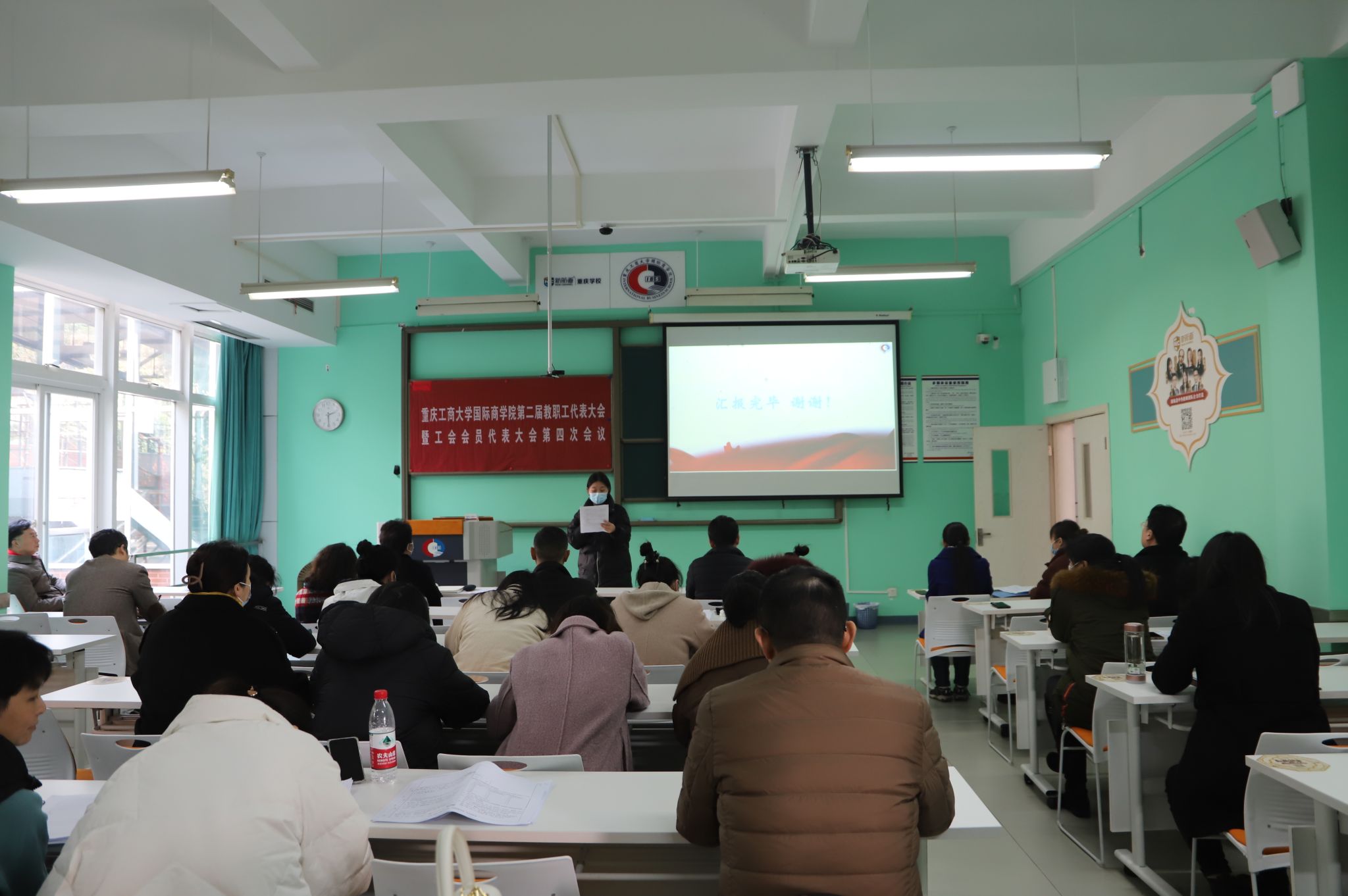 2024年1月12日下午,伴随着嘹亮而雄壮的国歌声,太阳成集团tyc33455cc第二届教职工代表大会和工会会员大会第四次会议在国商大楼502教室召开。参加本次会议的教职工应到71名,实到62名,会议由公司党总支书记黄谦主持。
