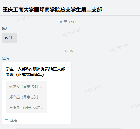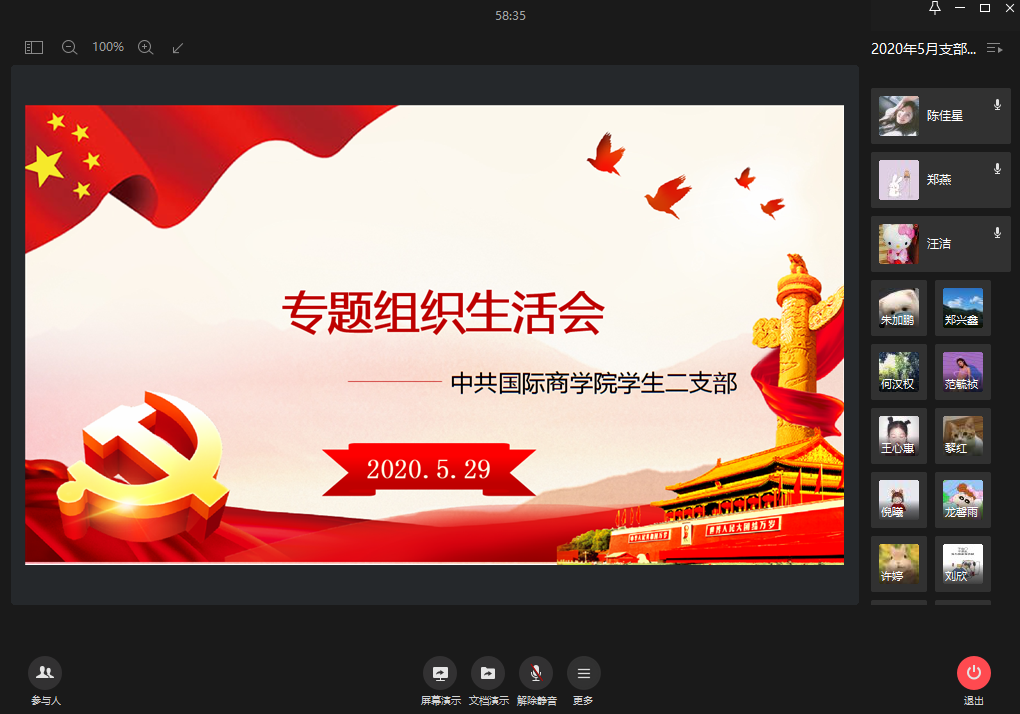 2020年5月29日,中共公司党总支员工二支部在企业微信群召开了5月份的支部大会,本次会议主要讨论了何汉权、郑兴鑫、马晓琴、陈佳星、龙馨雨、陈艺炜、许婷、刘欣的转正问题并开展了本月的主题党日活动。员工二支部书记汪洁老师,党支部王娟老师、田莎老师、冯诗淇老师、黎红老师、彭丹老师及二支部全体成员参加了本次大会。支部大会应到26人,实到27人。