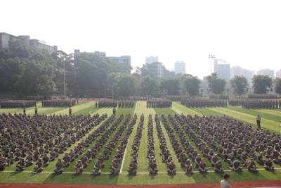 清晨日出的太阳翻越龙脊山山脊时军训开始了,然而平日里或是奔跑在通往教室的台阶上,或者刚刚起床,或是依旧陶醉睡梦之中,甚至刚刚入睡的老员工们,此时此刻的确正笔直的站在操场上;傍晚当落日的余晖透过枝叶繁茂的黄角树撒下最后一缕阳光,月亮在天空的一个角落隐隐若现,在一阵又一阵起伏的脚步声与口令声中,渐渐的操场的四个角落亮起明亮的灯光,把所有挥汗的身影深深地烙刻在绿茵场、红跑道上,为青春镌刻一道明晰的痕迹,无所谓痛苦,无所谓悲伤,所有付出都属于历练后的成长。