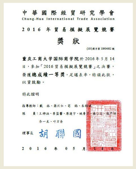 2016海峡两岸国贸论坛暨两岸校际模拟商展竞赛总决赛一等奖奖状