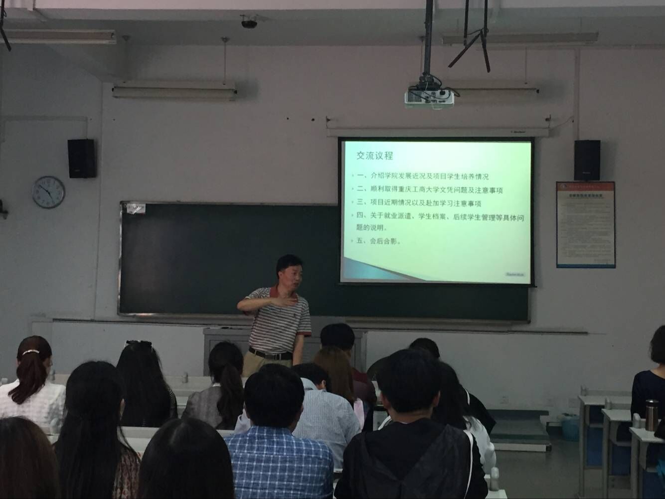 会议首先由李大鹏经理对参会家长表示热烈欢迎并对通过对方大学考试的同学表示祝贺,希望各位同学出国后继续努力取得更好的成绩。庞助理介绍公司发展近况并对员工提出殷切希望,苟部长和熊老师分别就员工归国取位及员工后续等工作向大家做了详细讲解。最后由陈昌盛副教授给员工介绍了对方公司的总体情况并和员工分享了对方公司员工生活等情况。