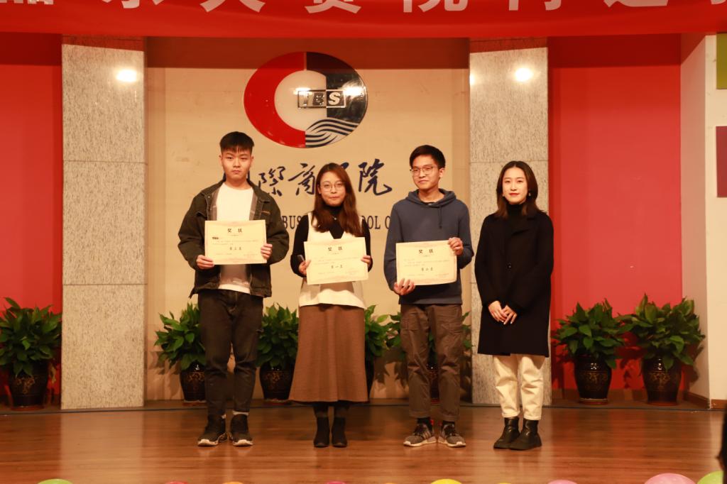 10位参赛选手演奏完毕,工作人员严格紧张的统计分数之际,评委对参赛选手的表现进行逐一点评。最后,热烈祝贺18级中加4班的周含同学的琵琶演奏获得第一名,17级工管2班的谭泽豪同学获得第二名,18级人资1班的姚哲同学获得第三名。三位评委依次为前三甲颁奖,并合影留念。
