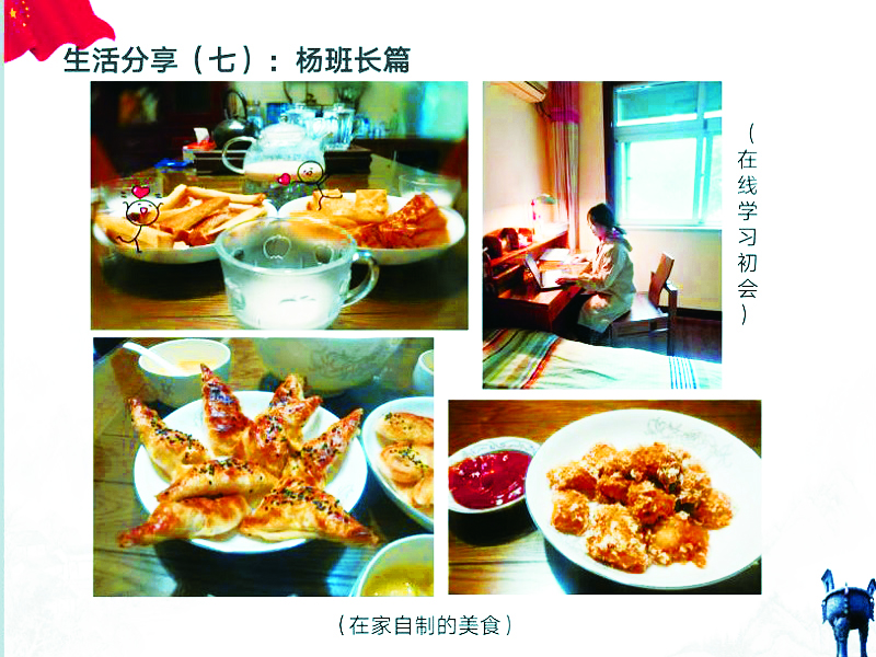 同学们积极地将自己所见所闻都分享在群里,有的分享了自己宅家的生活,有的同学厨艺大大提升,有的学习了历史……可以看出,大家都尽量地在使自己的生活过得更多姿多彩。有的团支书还邀请班上的同学分享在防疫期间担任地方退役军人志愿者的感想。他说他由衷佩地服医务工作者们的辛勤付出和默默的努力,虽然他做的远不及那些抗疫一线的服务者们,但是通过这次防疫抗疫,他深刻地感受到了作为中国人的自豪。