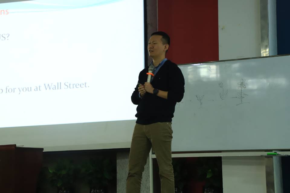 马壮老师以一段流利的英语开场,用幽默的话语分享自己在国外留学和上班的有趣经历,更用照片展现自己的生活环境以及状态。他围绕hope,happiness and success三个词讲述他的创业之路。Hope意指希望,他告诉我们,即使面对的困难再多再难,也要在心中一直充满希望,不要气馁,更是用自己失败的经验将这个词生动化;Happiness意指幸福,他希望我们看待任何事物都要往好的方面去想,因为任何事物都有两面性;success意指成功,他用自己的学途经验告诉我们,首先你要拥有hope和happiness两大因素,success自然会向你走来!每个要素讲完之后,马壮老师都会给同学们一些建议以及相应的技巧,同学们听得很认真。