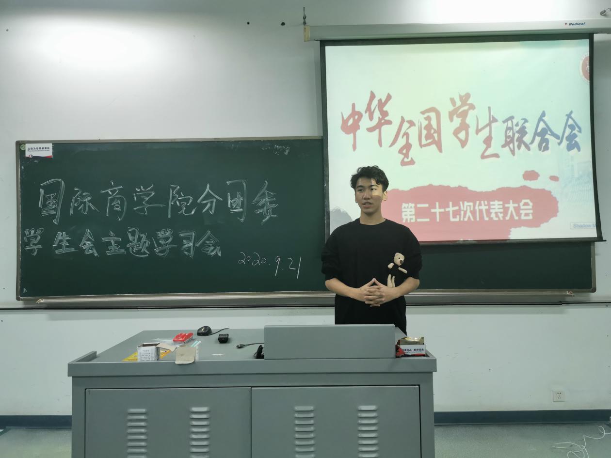 图为:刘星驿同学为员工会全体讲述中华全国员工联合会第二十七次代表大会会议内容