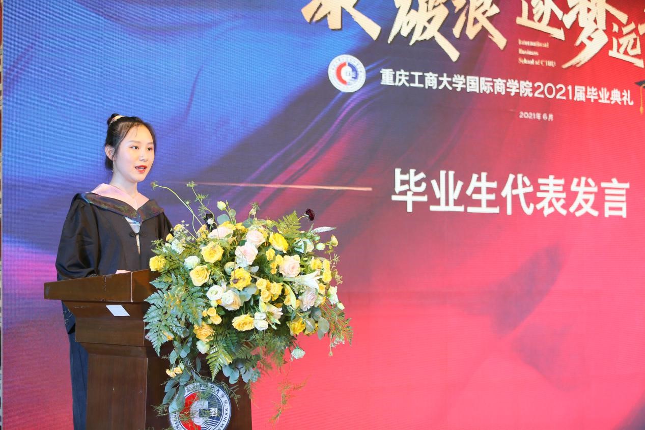 第三个环节是毕业生代表唐嘉堃同学代表全体毕业生发言。发言中,她表达了自己对母校的热爱,对老师的感谢,对同学的不舍,也表示21届的毕业生会带着母校的嘱托和祝福扬帆远航。
