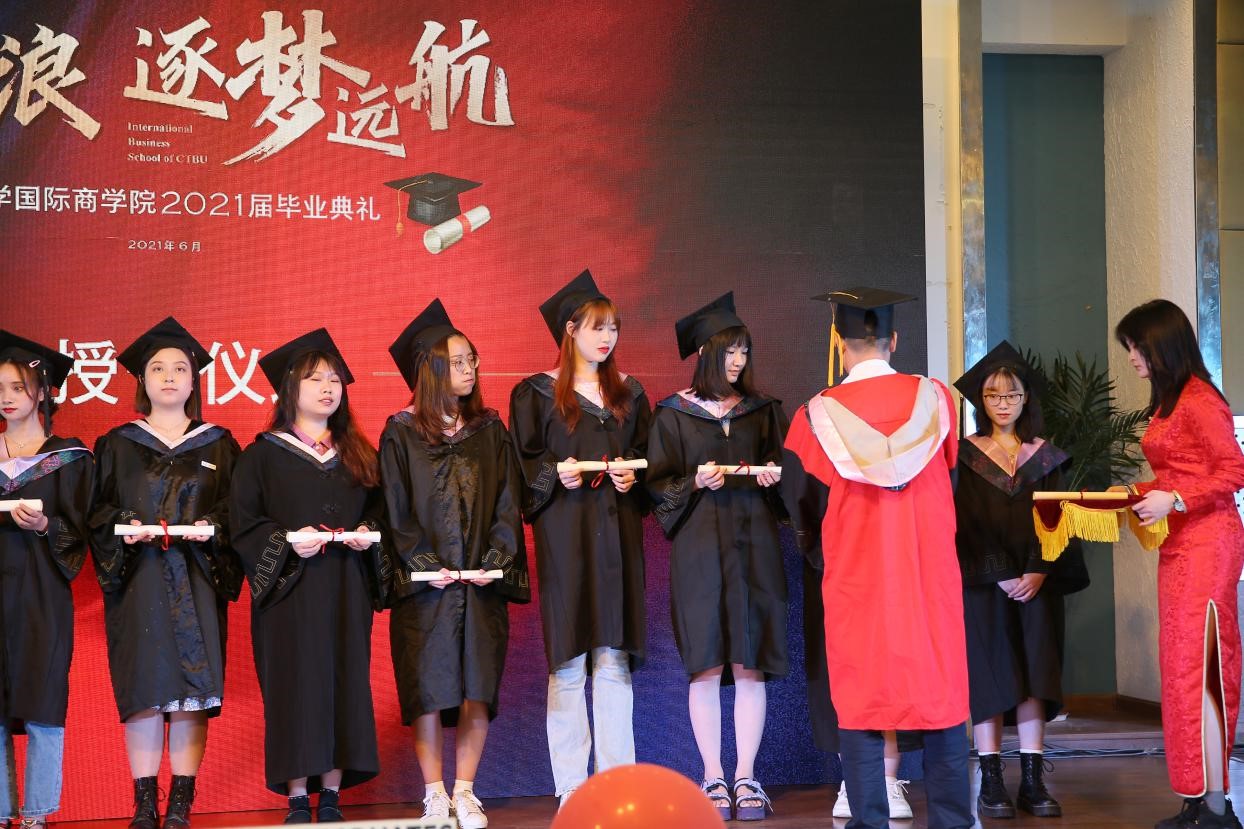 第六个环节也是本次典礼最激动人心的环节——学位授予仪式。随着悠扬的音乐,毕业生一组组依次上台领取学位证书。公司经理赵驹教授,为每一位同学授予学位证并拨穗,寓意着稻穗成熟,毕业生们已学有所成,可以展翅高飞了。活动结束后,同学们纷纷在公司拍照留念,希望用照片将自己的青葱年华定格,永远留在工商大。