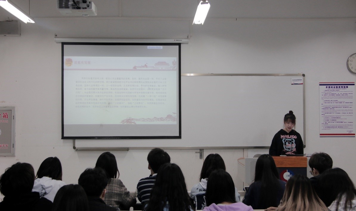 随后,员工会主席团成员金亦程同学介绍了学习交流会的第二部分,“说重庆生活”。陈书记在座谈会上表示,当前,重庆与全国一样,开启了全面建设社会主义现代化的新征程,紧紧围绕把习近平总书记殷殷嘱托全面落实在重庆大地上这条主线,坚持从全局谋划一域、以一域服务全局,立足新发展阶段、贯彻新发展理念、融入新发展格局,奋力谱写重庆高质量发展、高品质生活新篇章。金亦程同学总结道,我们作为在重庆学习生活的青年,应该关心关注重庆发展,思考自己能在重庆现代化建设进程中起到什么作用,贡献什么力量。