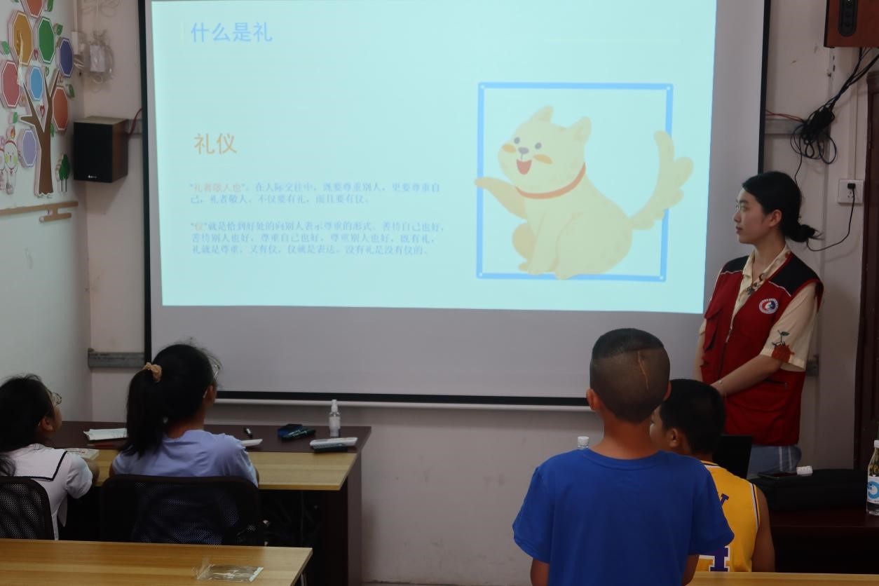 在活动过程中,志愿者夏星雨通过情景模拟小课堂带领小朋友初步认识了什么是文明礼仪、日常不文明行为有哪些,并引导青少年规范自身行为礼仪,让小孩子们讲文明、知礼仪。随后,志愿者为小朋友们进行了礼仪知识的系统讲解,对于仪容仪表、餐桌礼仪、乘车礼仪、见面礼仪等进行了标准示范。同时,志愿者通过趣味问答、画画等活动,寓教于学,让小朋友们在活动中充分展示自我,感悟中华礼仪文化,增强自身文明修养,促进青少年健康成长。