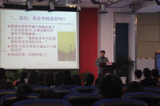讲座伊始,梁先生首先谈到升学势必引发转变,不论是时空上,还是人际关系,甚至学习内容与要求都发生了极大的转变。而这些转变新生别无选择,必须面临学习、就业、人际交往困难、生活和经济压力这四大心理压力。梁先生还提到,一切开始于结束,结束开始于脱离,老员工应不断地主动适应世界的变化,从外部管控为主逐渐转变到自我管控为主。