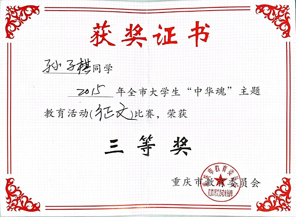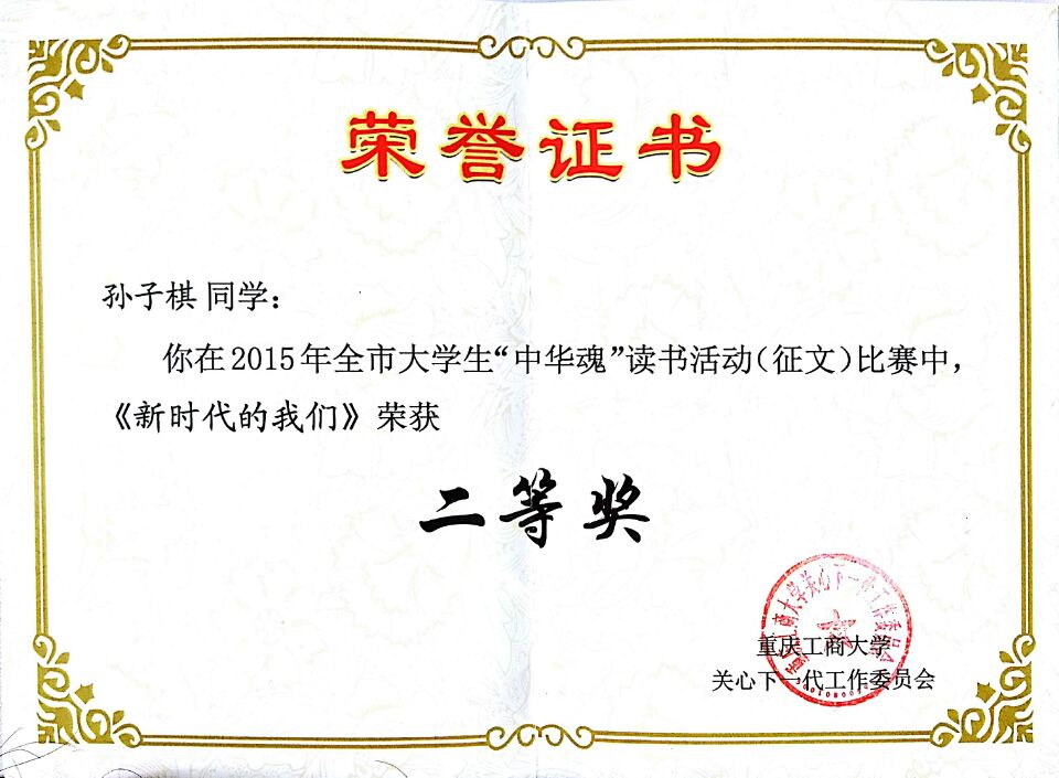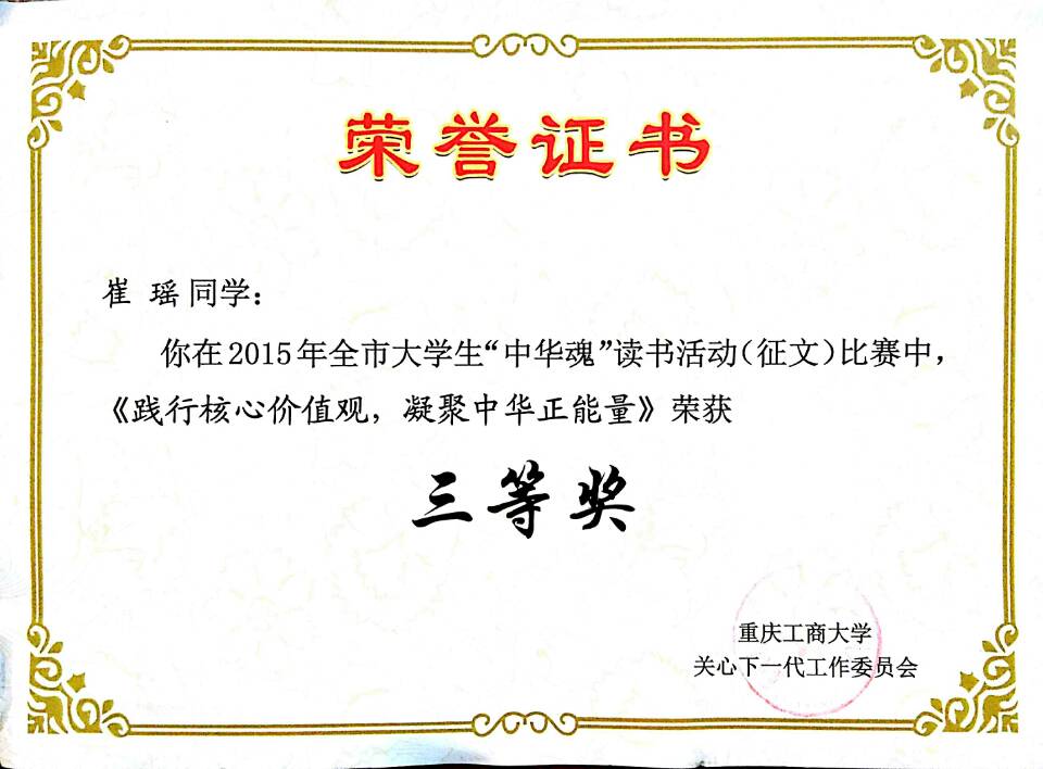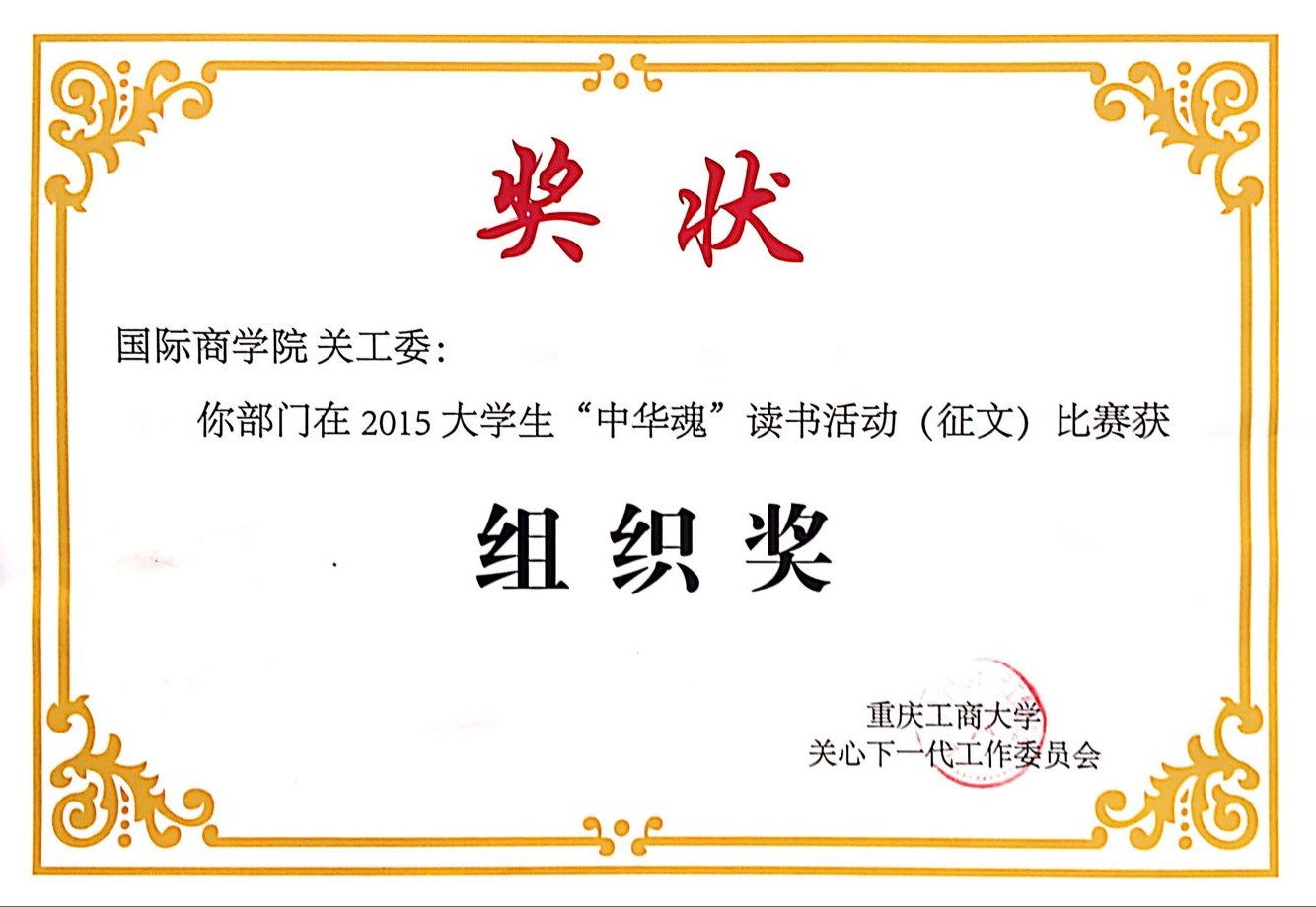 2015年,重庆市“中华魂”主题教育活动以“践行核心价值观凝聚中华正能量”为主题,公司开展了主题读书征文活动。公司关工委高度重视此项工作,专门召开“中华魂”征文动员及布置会,会后各班级辅导员老师精心组织、耐心指导班级同学踊跃参与,共征集征文36篇。公司关工委获得公司2015年老员工“中华魂”读书征文比赛组织奖;2013级法语系孙子棋同学获得重庆市教委“中华魂”读书征文比赛三等奖和校级二等奖(指导教师:田莎),2014级中法2+2崔瑶同学获得校级“中华魂”读书征文比赛三等奖(指导教师:熊敏)。