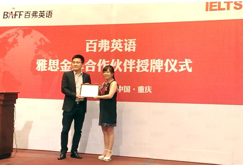由英国文化教育协会、雅思官方机构参与百弗英语主办的,百弗英语雅思金牌合作伙伴授牌仪式6月20日在重庆希尔顿酒店举行。公司赵驹经理的代表庞卫真助理及教师代表受邀参加了授牌仪式。