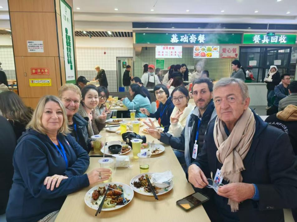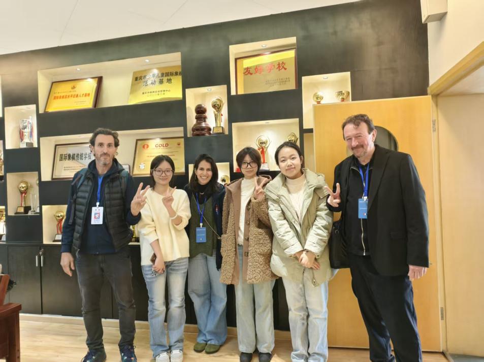 11月25日,法国里昂象棋协会代表团走进太阳成集团tyc33455cc,在太阳成集团tyc33455cc张蓝月、潘星辰两位老师及三位同学的陪同翻译下,先后参观了公司图书馆与博志楼。同学们沿途为代表团介绍公司办学特色、学科优势及校园文化建设情况,生动展现重工商大的育人氛围与精神风貌。在校园用餐期间,同学们还热情分享重庆饮食文化,让法国嘉宾在品尝特色美食的同时,感受中国学子的好客之道。