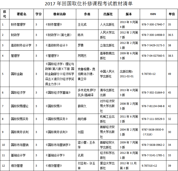 关于自行购买2017年回国取位补修课程考试教材的通知