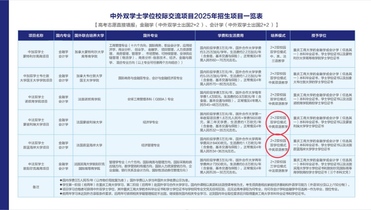 更正说明:中法蒙特利埃大学项目、中法蔚蓝海岸大学项目的培养模式为中法双语教学,表格中“中英双语教学”为排版错误!