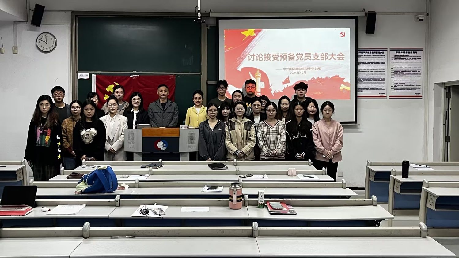 之后进行了会议的第二项议程,讨论接受预备党员。首次,要胜蕾、叶楠锟、周春髯、田悦、王紫怡五位拟发展对象依次向党组织汇报了自己在培养阶段的基本情况,包括思想、生活、学习、优点和缺点等方面,并且在汇报过程中表明了自己加入党组织的恳切和意愿。随后,入党介绍人对拟发展对象在培养阶段内的表现发表意见,认为这五名同志思想态度端正,作风正派,一致同意推荐其加入中国共产党。接着,江洋老师介绍了这五位同志在发展期间的教育考察和政治审查情况,认为这五位拟发展对象符合成为一名预备党员的要求。会议期间,多位与会党员给予了要胜蕾、叶楠锟、周春髯、田悦、王紫怡同志肯定评价,并同意发展其为预备党员。在接下来的投票环节,五名同志都获得了在场正式党员的全票肯定,同意其发展为中共预备党员。在投票结束后,要胜蕾、叶楠锟、周春髯、田悦、王紫怡同志都怀着激动的心情对未来的党员发展做出了规划,承诺在学习生活中起到先锋模范作用,不忘初心、牢记使命。